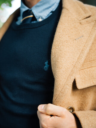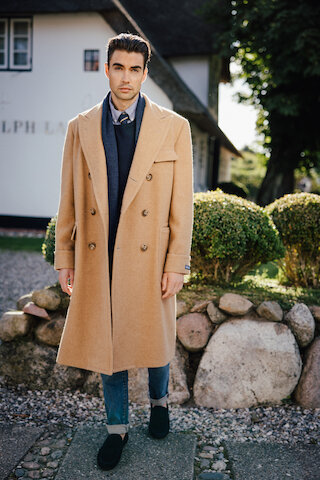 Der Polo-Mantel – ein absolutes Must-have für den Herbst. Benannt nach den Mänteln, in denen sich früher englische Polospieler zwischen den Matches aufwärmten. Ralph Laurens Version behält legendäre Details wie die zweireihige Silhouette und das Gürteldetail am Rücken bei, erhält jedoch dank dem gewebten Kamelhaar eine elegante Note.